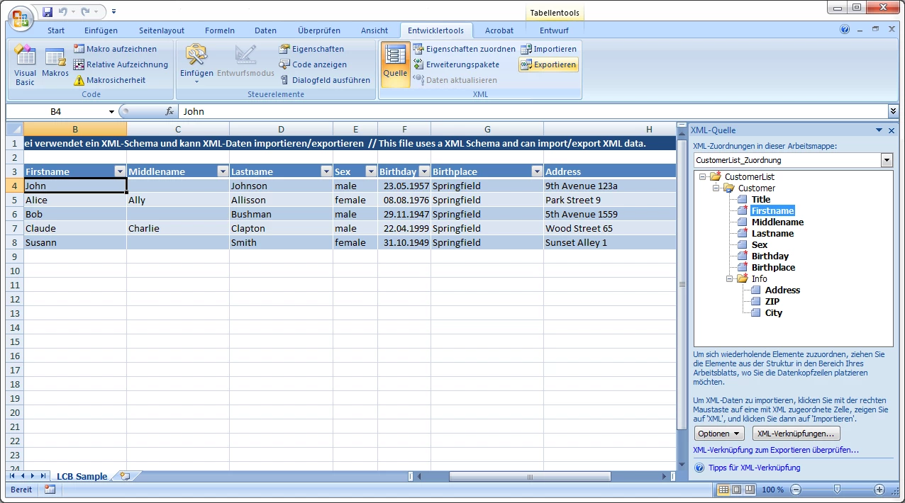 Okay, die XSD muss man dann in Excel einbinden, was über die Entwicklertools erledigt wird. Hier mal'n Beispiel, wie das aussieht. Da sieht man rechts den Aufbau, den die XSD diktiert. Man zieht dann einfach ein Element aus der Baumstruktur heraus auf die Zelle, die man verknüpfen will, schon erzeugt Excel dafür eine XML-Stuktur. Diese kann man dann einfach exportieren.