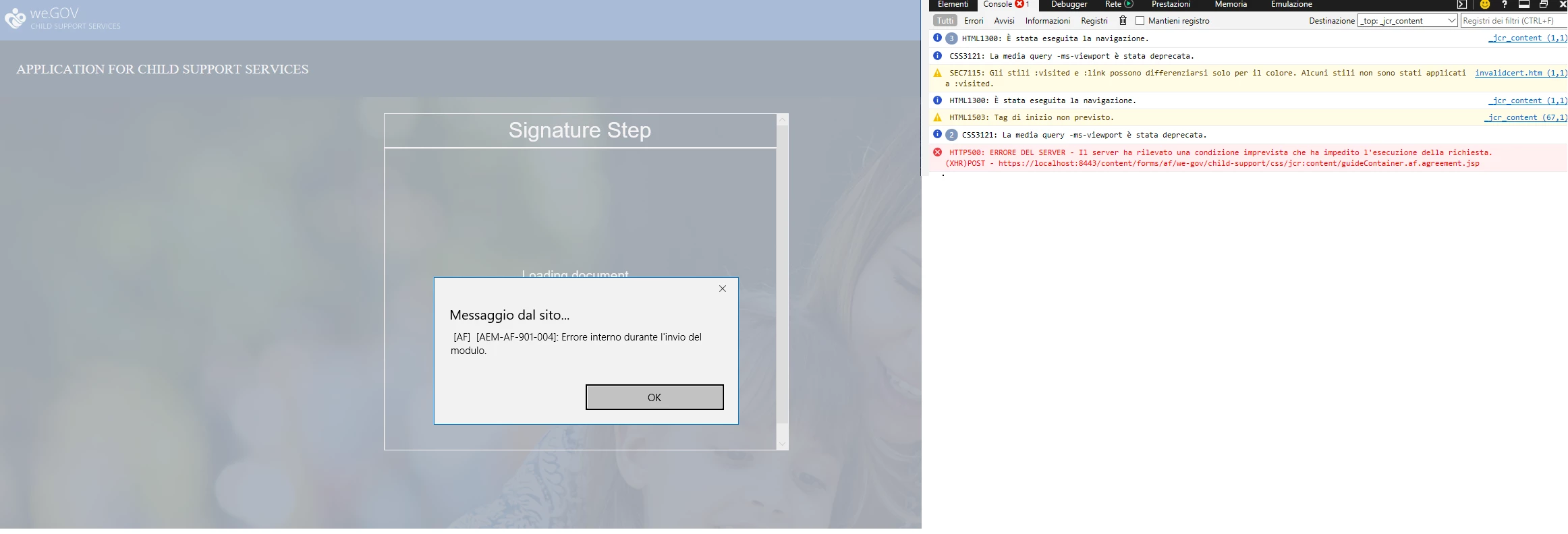 11.02.2019 17:50:10.896 *ERROR* [0:0:0:0:0:0:0:1 [1549903810635] POST /content/forms/af/we-gov/child-support/css/jcr:content/guideContainer.af.agreement.jsp HTTP/1.1] com.adobe.aemds.guide.servlet.GuideSubmitServlet Could not complete Submit Action due to Error during document of record generation.