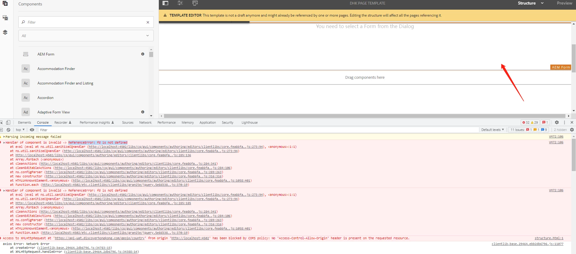 I faced some errors after adding the AEM Form component into Site Page editable template structure: