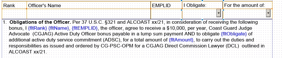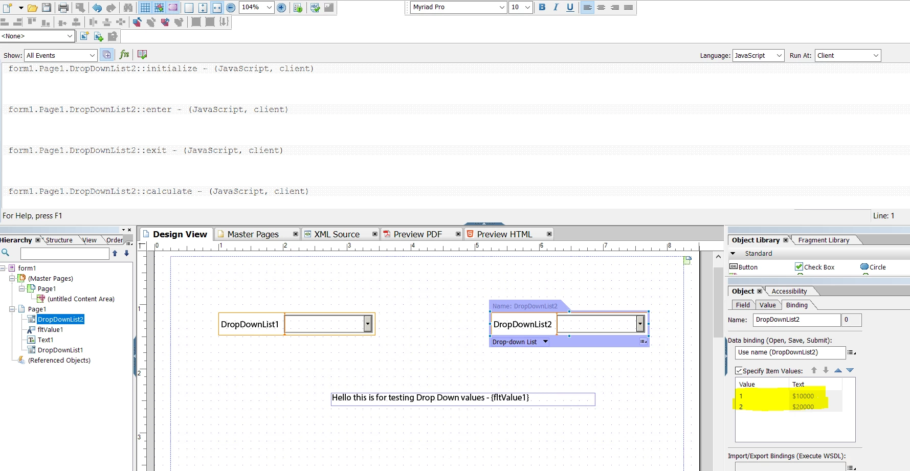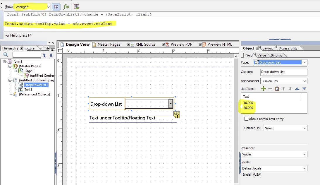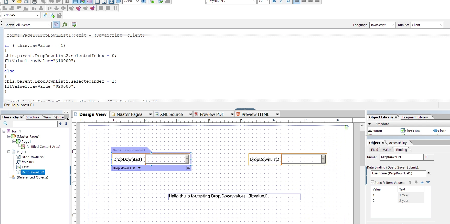 I've created a form using floating texts. One of the fields is a dropdown list with two options: One (1) or Two (2). I labeled this as: fltObligate. The other field is a floating text field. I labeled as: fltAmount. What I'm trying to do is this: if I make a selection from the dropdown list, I would like it to return an amount value in fltAmount.