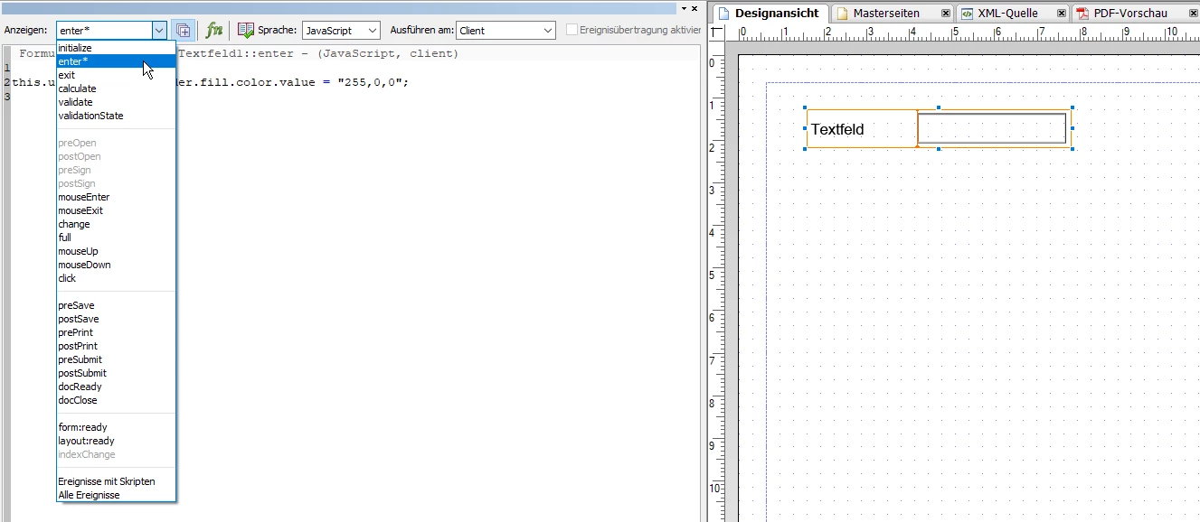 Designer hat einen Skript-Editor, in dem man Skripte für viele unterschiedliche Ereignisse für z.B. Felder in dem Formular hinterlegen kann. Diesen kann man mit [Strg]+[Shift]+[F5] ein- und ausblenden.