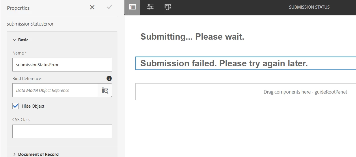 Having an issue with AEM Forms where elements that are configured to be hidden are still showing up on the page (submission-status-issue.png). I've been testing our site on slower network speeds by using Chrome's dev tools to throttle the browser connection to 3G and disabling the cache. This causes the page to load very slowly (which is expected). However, when the page finishes loading there are blue and red alert boxes that are displayed when they should be hidden. When I view the html after the slow page load completes, I notice that the alert boxes don't have the "hidden" or "active" classes on their field elements. I believe those classes are something AEM adds based on whether the Hide Object option is checked or not in the component configuration (submission-status-config.png). Since they don't have the classes, they display. So it seems like there is an AEM event or process that doesn't fire to add the appropriate class on slower connections.