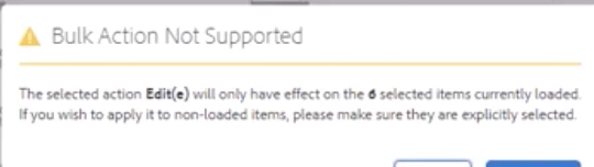 | Request for Feature Enhancement (RFE) Summary: | We noticed recently the new warning message added to AEM bulk edit scenario, where user attempt to “Select all” and edit these sub-pages in separate tabs. The warning message says that “Bulk action not supported, The selected action Edit(e) will only have effect X selected items currently loaded…”. As we understand, the justification for that warning message is to let user know that not all sub pages might have been lazy-loaded, and that’s fine. That also explains why the massage doesn’t need to appear when pages have been selected manually. The point is that the mentioned logic might be confusing when there are only few sub-pages to be selected by “select all”. In that case lazy logic is not the case and user can be sure that “select all” picks all the sub pages we have on the screen. Please consider extending that logic, because our customers feels uncomfortable with new behavior and confusing warning. (More detail you can find in thread for Case #E-000797571) |