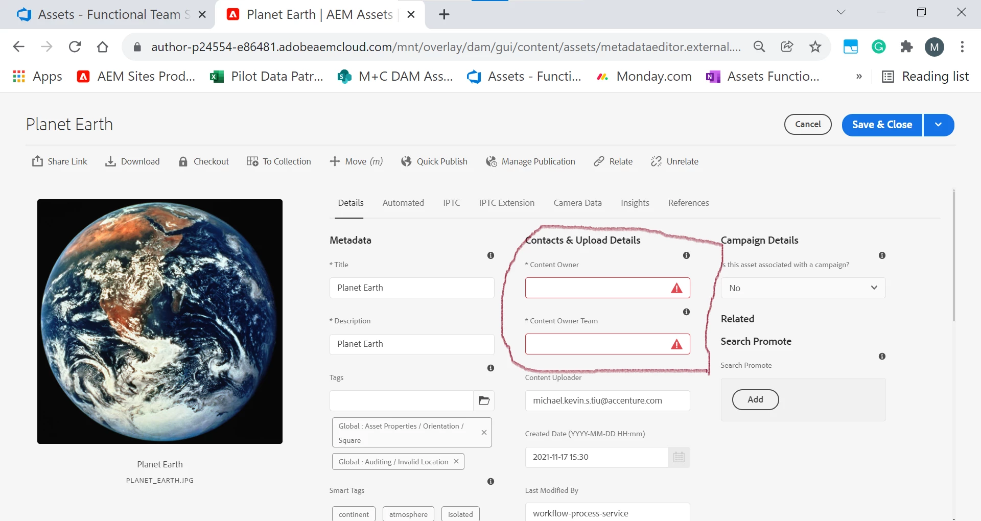 Request for Feature Enhancement (RFE) Summary: As a user, I’d like to see a red notification pop up that lets me know I’m missing values in the *Rights Managed Asset field so that it will display the same way as other required data fields.