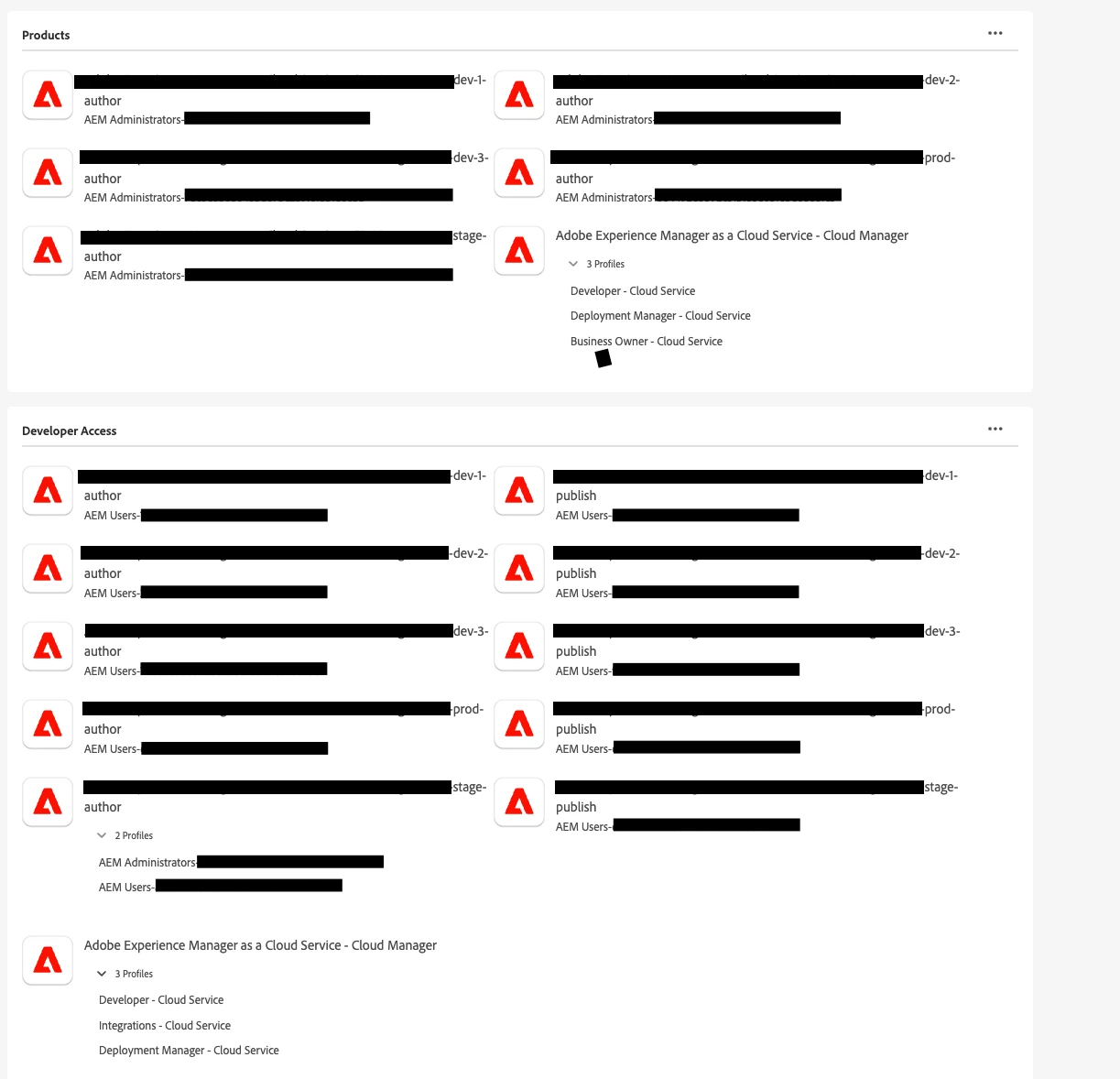 Our team is migrating from AEM on-premise to the Cloud and we're running into permission issues left and right. When the developers are accessing the environments we run into roadblocks along the way. It appears that when a new environment gets created, the developer who created the environment doesn't have assigned permissions to be a User of that environment? It feels unreasonably complex. Could I be pointed to or assisted with the proper way to assign profile permissions? I'm attaching a screenshot of one User's permissions to the different environments. See how many product profiles we have to work with. Now, mind you we have a few dev environments for testing as we manage this, but it just feels unreasonably complex to have to add users one at a time to different environments and profiles.