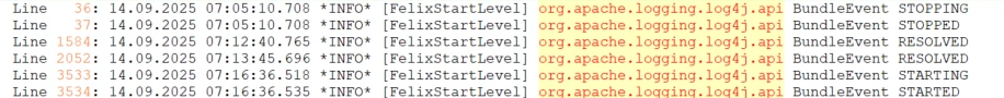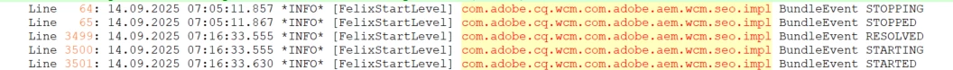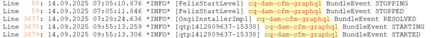 However, one bundle was not activated. Specifically, cq-dam-cfm-graphql was stopped and tagged with [FelixStartLevel]. After that, it transitioned to the Resolved state, but this time the tag changed to [OsgiInstallerImpl] instead of [FelixStartLevel]. Please disregard the last two lines in the log, as I manually triggered the bundle to start.