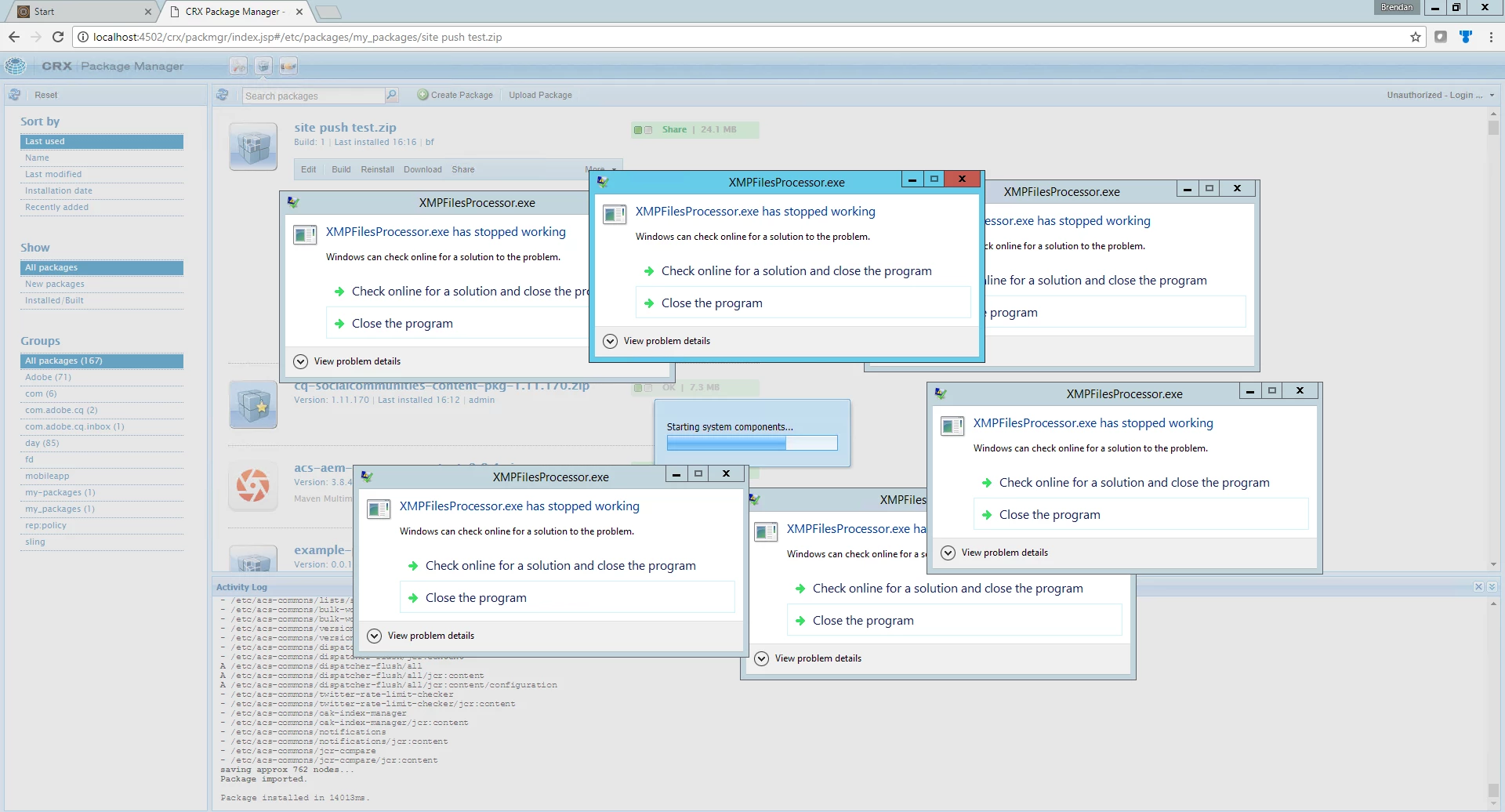 The logfile has a bunch of stuff in it as well, mostly errors that they can't find an email for my username (bf), which would make sense since I did not add an email and things such as warnings that I need to allow a certain mime type when importing a file. The package says it installed correctly, but now there is a httperror 500 when AEM tries to start. The package says it installed correctly, but when trying to do anything in AEM this message appears.