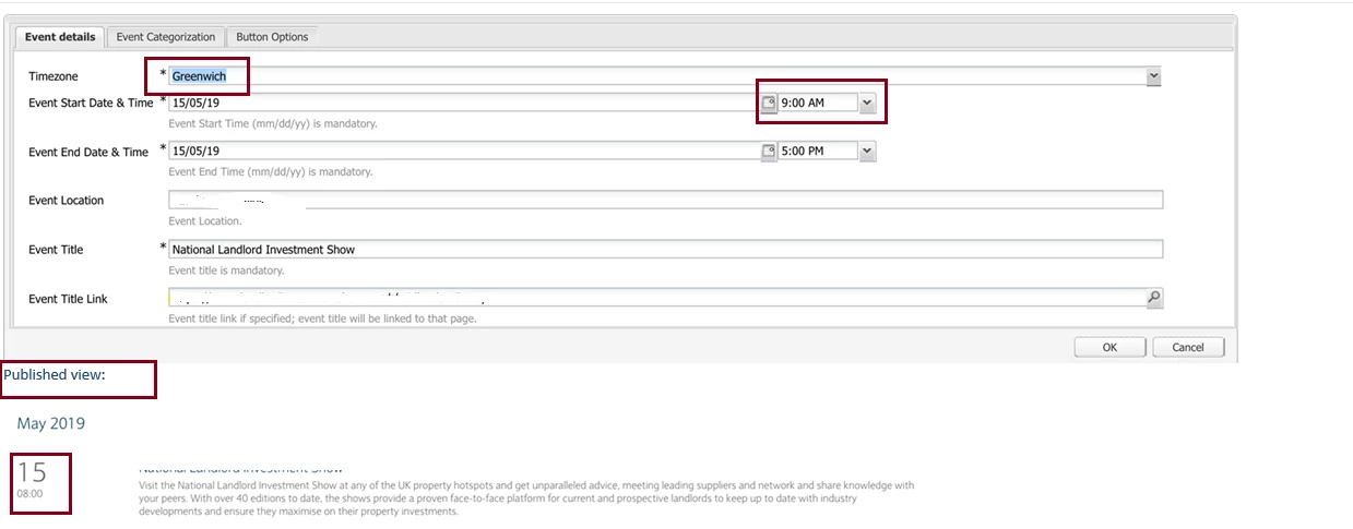 The first view is in edit more where you can see i have set the even start time as 9AM but once the site is published the event start time is showing is showing as 8AM.