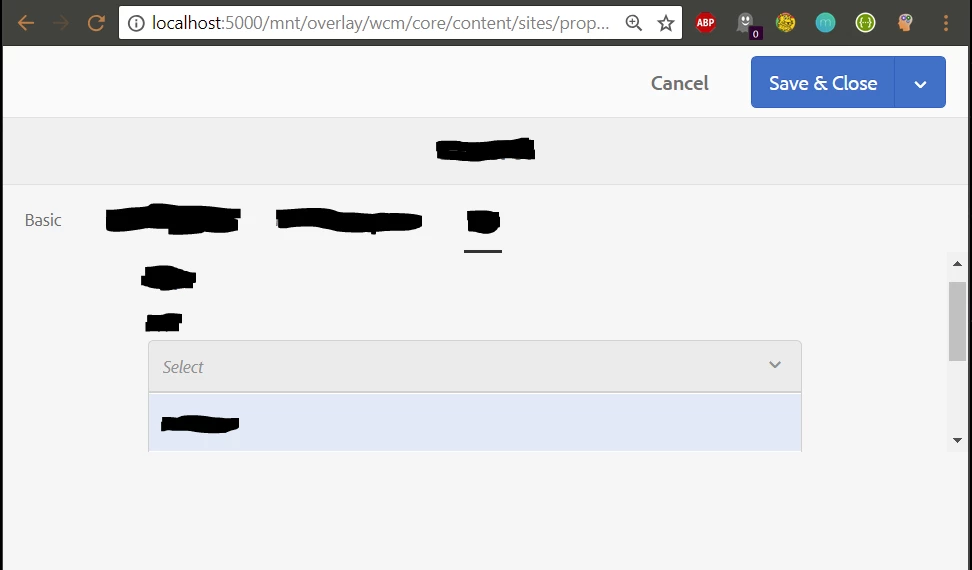 aem 6.4 page properties: select options broken when last field