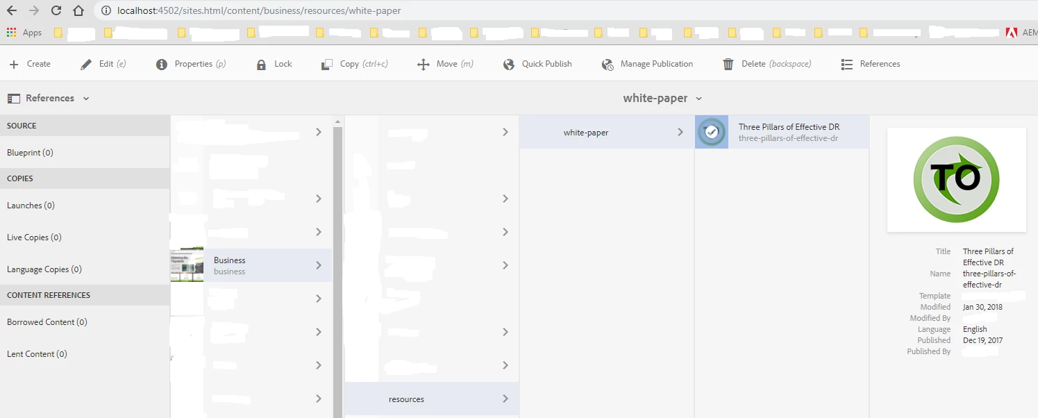 Hi all, I'm experiencing problems when using References from the rail selector. When I navigate to a PDF and go to the rail selector drop down and choose "References", I'm expecting to see a list of pages that reference this PDF (image 1). As you can see, I get zero results. Image 2 is showing a page that is referencing the PDF via an Article Teaser component. Does anybody have any pointers or suggestions as to why I experiencing this type of behavior in 6.4? For what it's worth, we were previously running 6.2 without incident but since upgrading to 6.4 the problem has since presented itself.