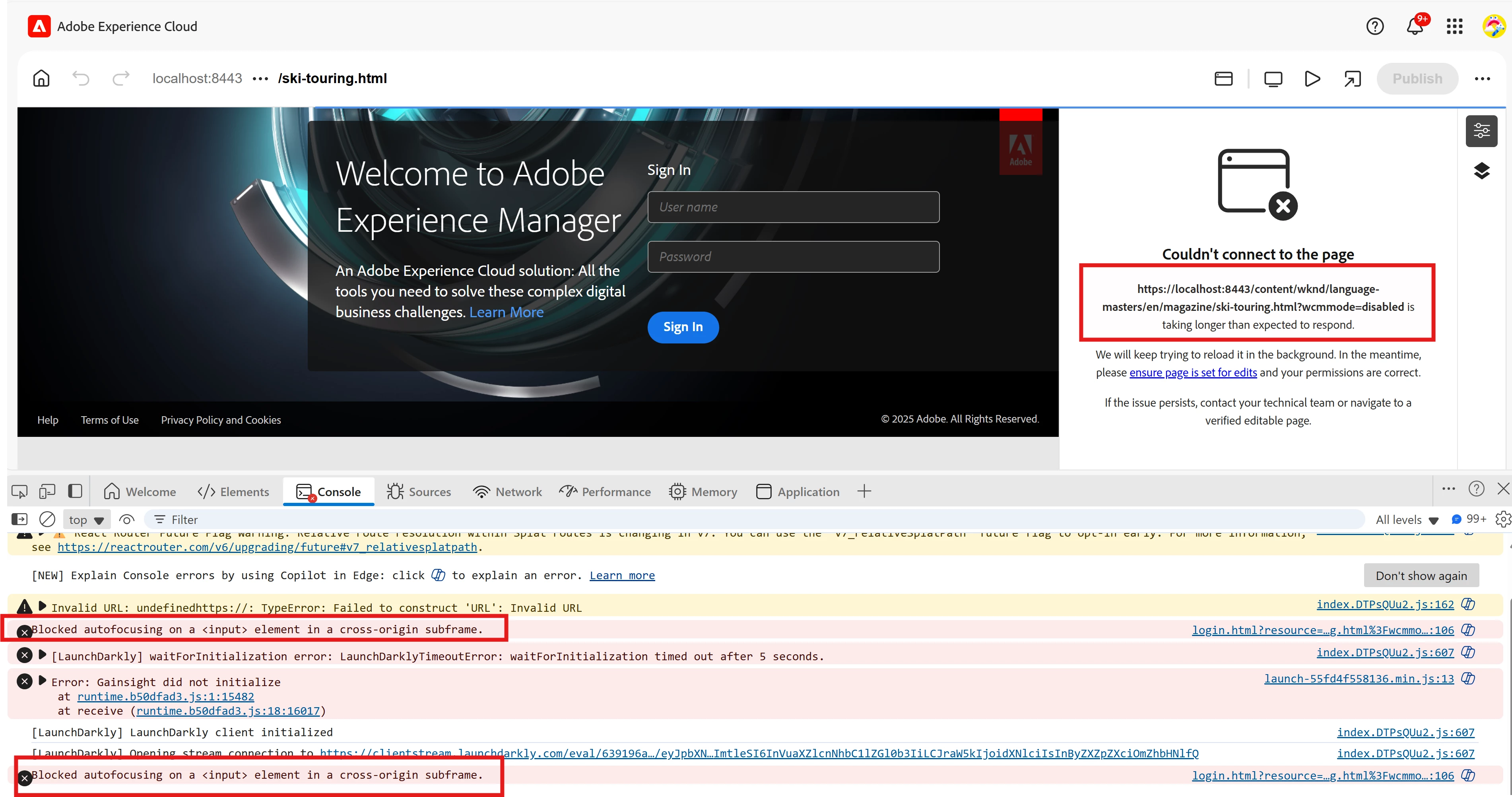 - when I try to load AEM page running on https (port 8443) inside universal editor, it gives this error "Blocked autofocusing on a <input> element in a cross-origin subframe." I followed whats mentioned in this document - https://experienceleague.adobe.com/en/docs/experience-manager-cloud-service/content/implementing/developing/universal-editor/developer-overview?lang=en for same site cookie settings but it doesn't help and I continue getting the cross origin error. Has anyone come across the same issue
