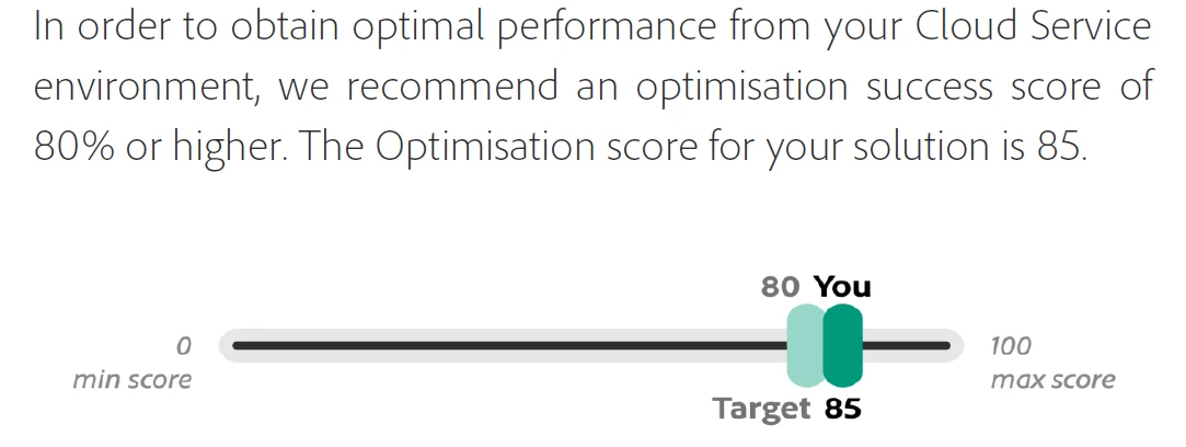 Optimization - This score provides a view of your optimisation against established AEM Cloud Service baseline metrics. It takes into consideration Cache Hit Ratio, and other performance and optimisation factors.