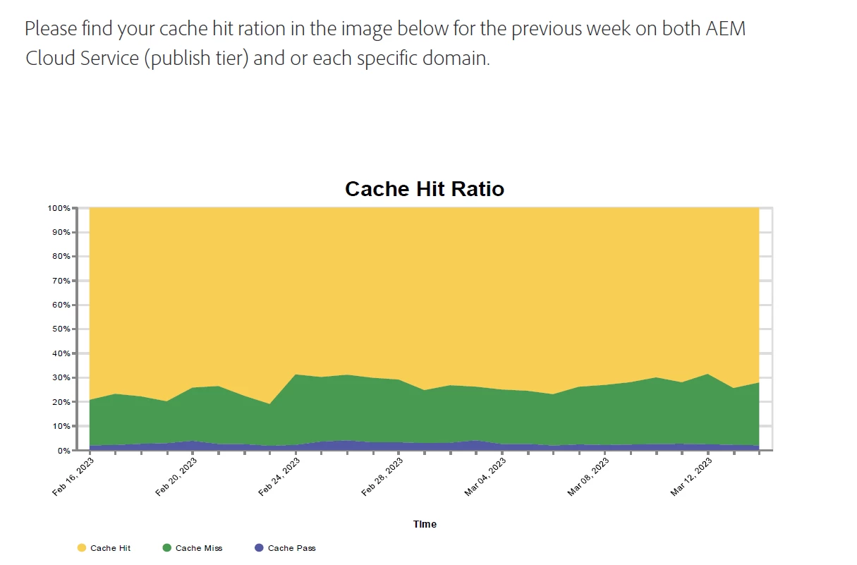 In the Web First Paradigm, the performance of a service is determined by metrics such as Cache Hit Ratio and Cache Coverage. Adobe advises to reach a Cache Hit Ratio of 90% or even higher to see fast experiences in delivering the pages of the website.