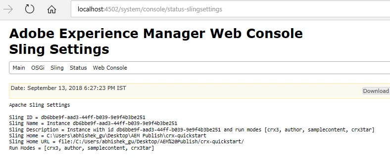 In the sling settings, it is picking Sling home and Sling URL from new folder i.e. “AEM Publish”. However in the run mode it is showing author,