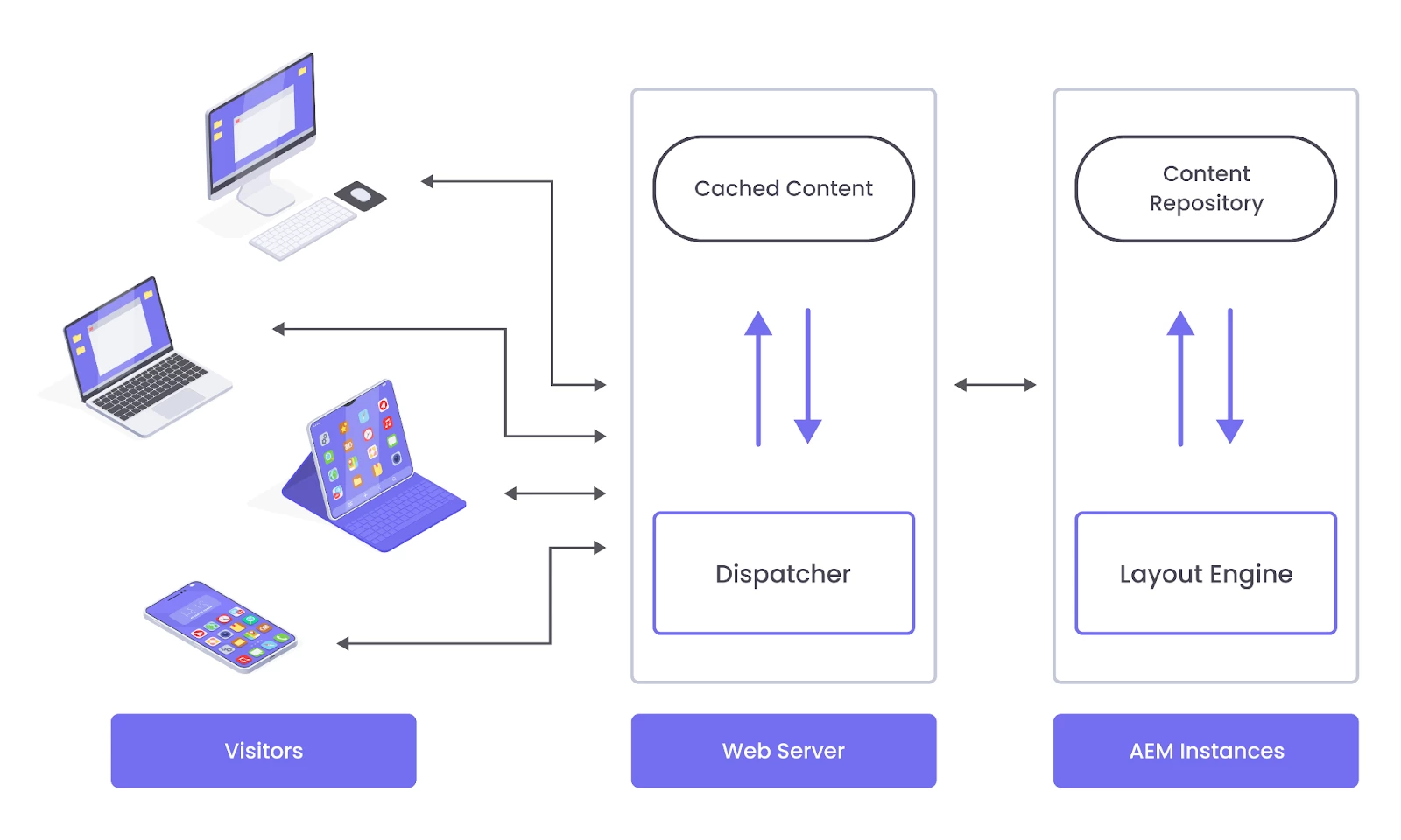 AEM Dispatcher is another vital layer in Adobe Experience Manager infrastructure. AEM Dispatcher is a web server that caches web pages produced by Publish instances and balances the load a web application receives. (Web servers shouldn’t be confused with the server where your files and other data are stored.) Instead of sending all the queries to the content repository all the time, AEM Dispatcher fetches and stores content to serve it on demand. This is especially useful for better web application performance, reduction of server response time, and helping web pages load faster.