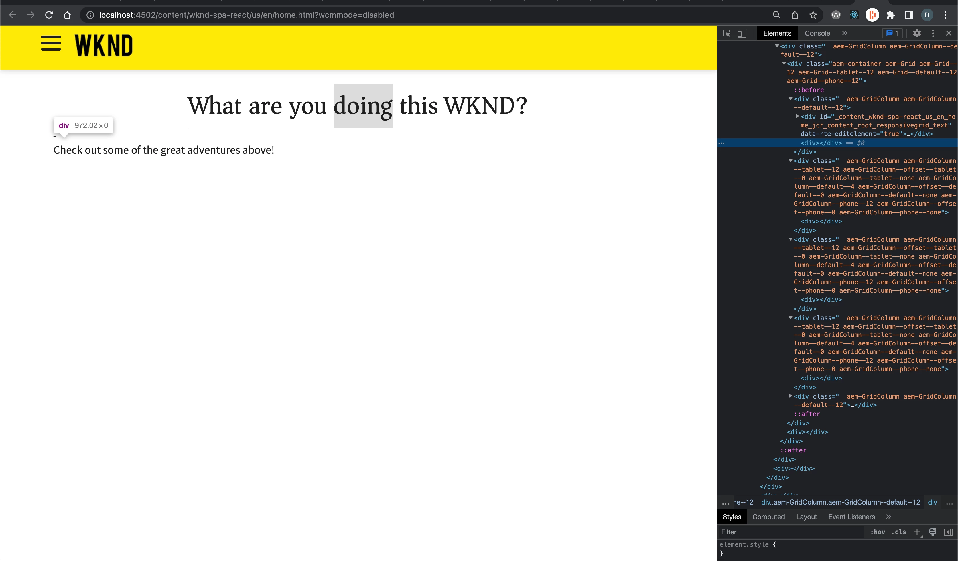 I have been debugging an issue with an AEM SPA React project where empty divs are rendered after each component in all environments. After realizing that this issue likely comes from the library that makes this implementation possible and not from the components implementation, I installed the SPA wknd tutorial solution and noticed the same problem. https://github.com/adobe/aem-guides-wknd-spa/tree/React/extend-component-solution