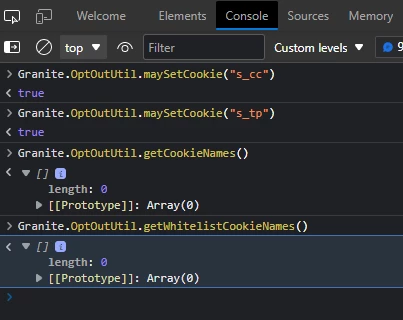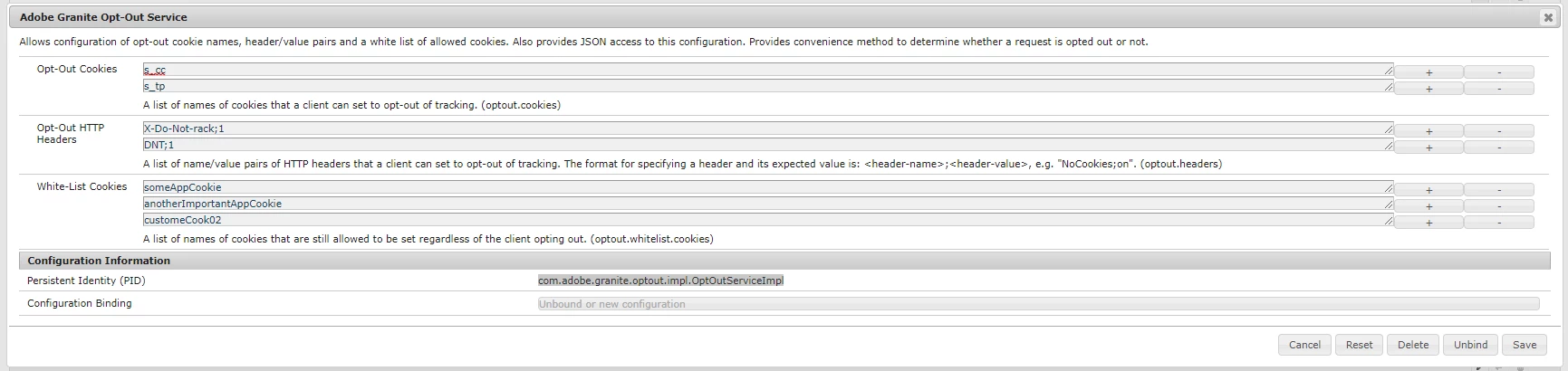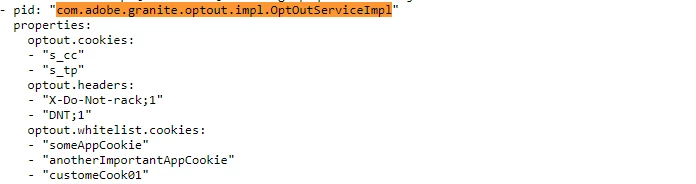 We are wanting to add a proper cookie-consent process in our website. Based on this documentation right here Configuring Cookie Usage | Adobe Experience Manager (using a different PID), we can configure the Adobe Granite Opt-Out service (PID: com.adobe.granite.optout.impl.OptOutServiceImpl). I've added a repository OSGi configuration inside the /config folder. I am using the Adobe Granite class to fetch these cookies (Granite.OptOutUtil.getCookieNames and Granite.OptOutUtil.getWhitelistCookieNames) and they output an empty Array. None of the cookies I have opted out is still being set. I have tested this both in localhost and cloud-dev (author/publish), it's not working.