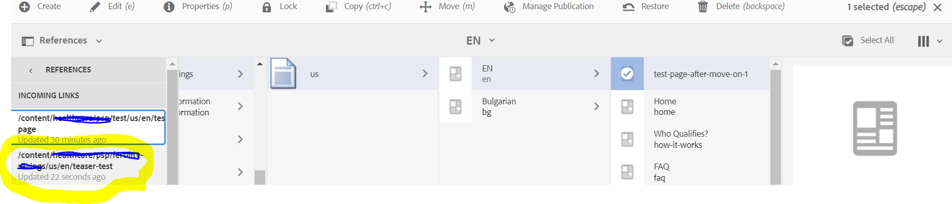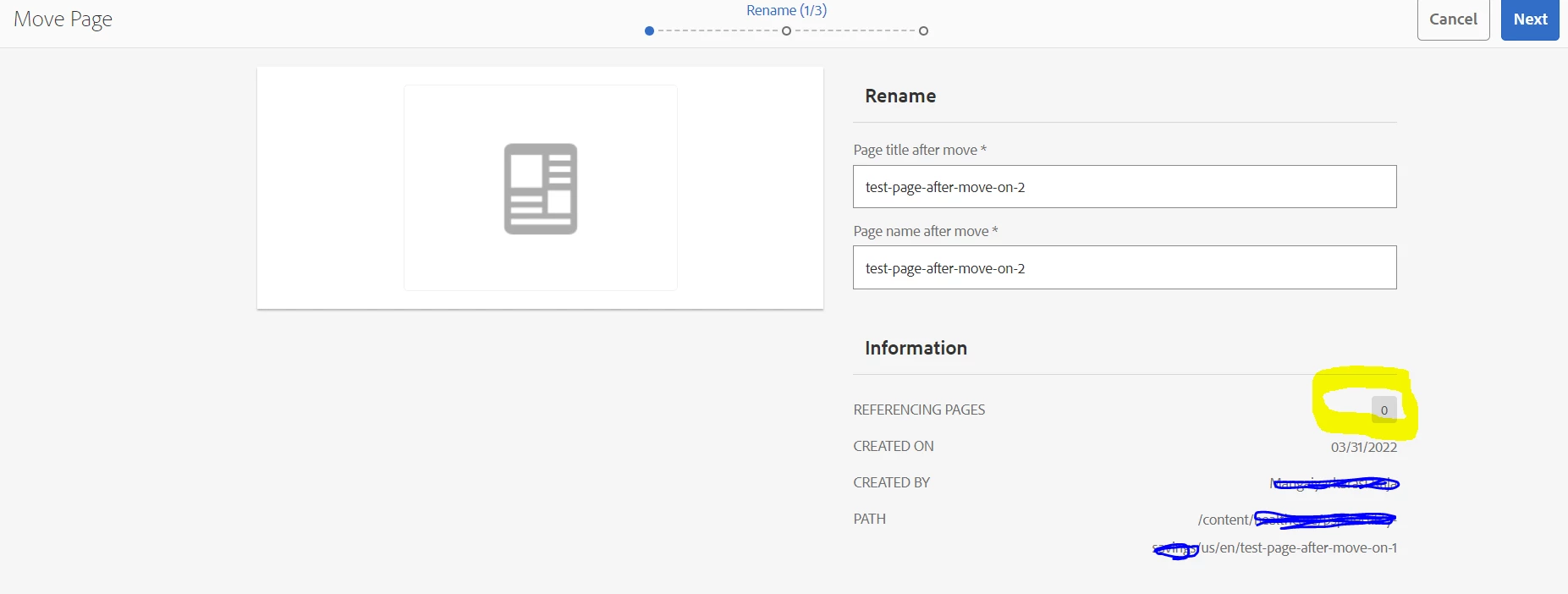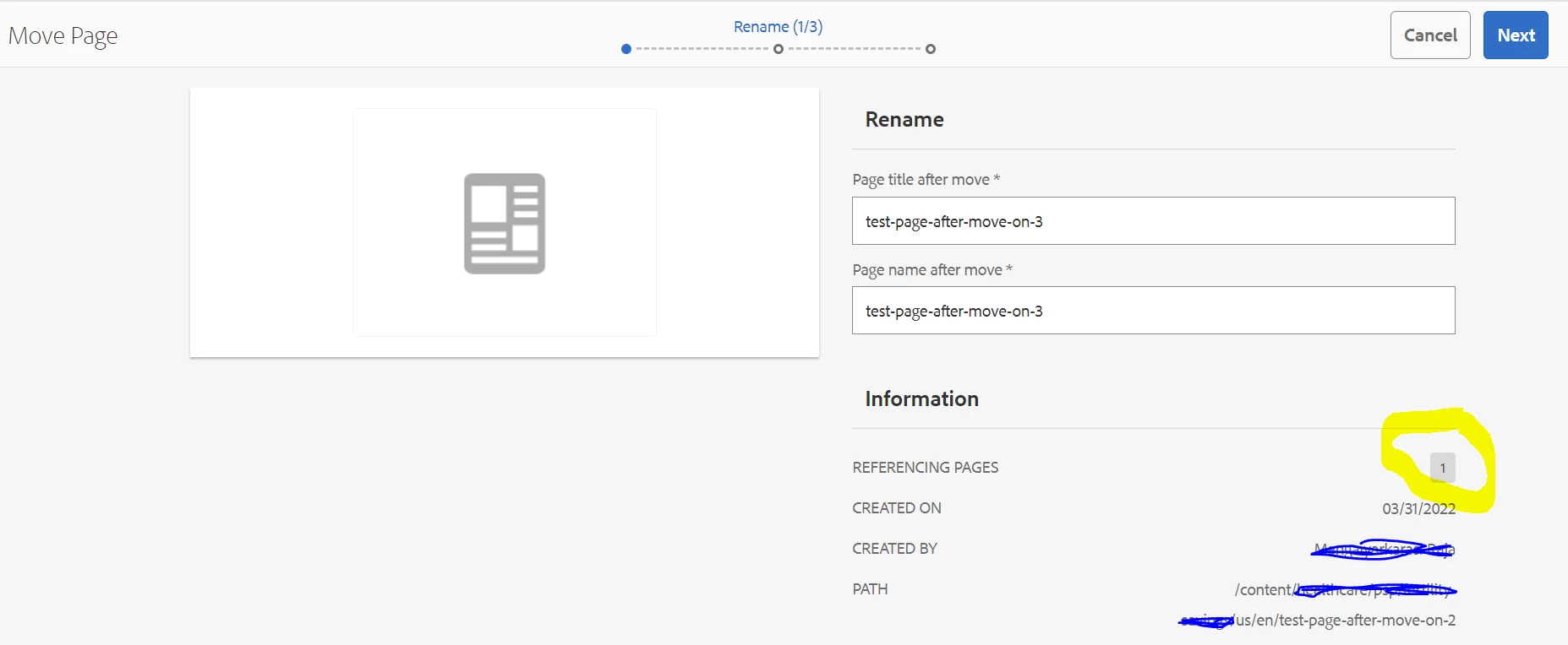 In Development environment, We see reference page count and Adjust option showed up when moving/renaming page like below with highlighted in yellow color, but in qa/higher environment it is not showing and which leads to issue where internal links are not getting updated after page moved/renamed.