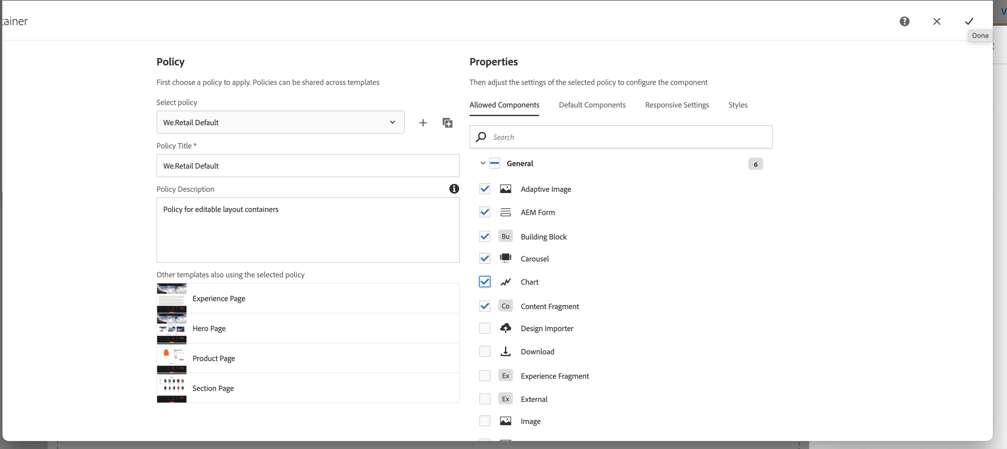 Yesterday, I received some really helpful advice around components and whether they're shareable across more than one site. Today, I wanted to follow the steps I'd been shown yesterday, but the components within the layout container are no longer visible, and when selecting the layout container I no longer see the 'policies' button. I may have inadvertantly pressed/delted something, but I can't for the life of me work out what.