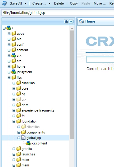 Notice that the cause is well down the stack and it is an IOException stating that /libs/foundation/global.jsp does not exist. If I browse the JCR, using CRX/DE, I clearly see that it is there.