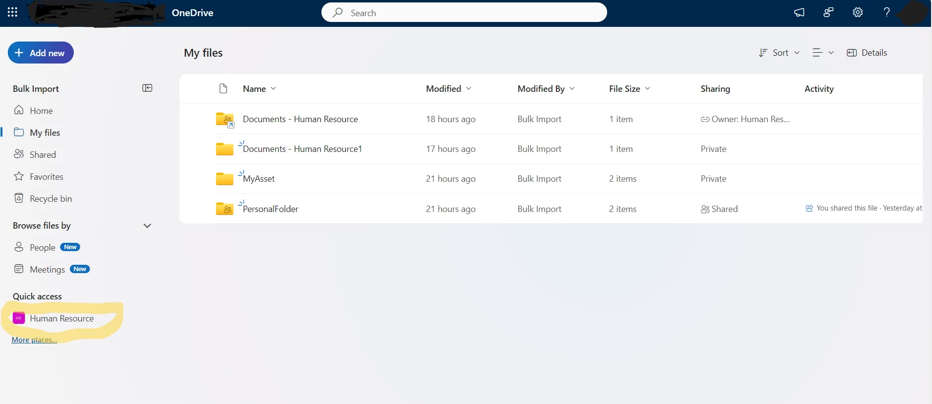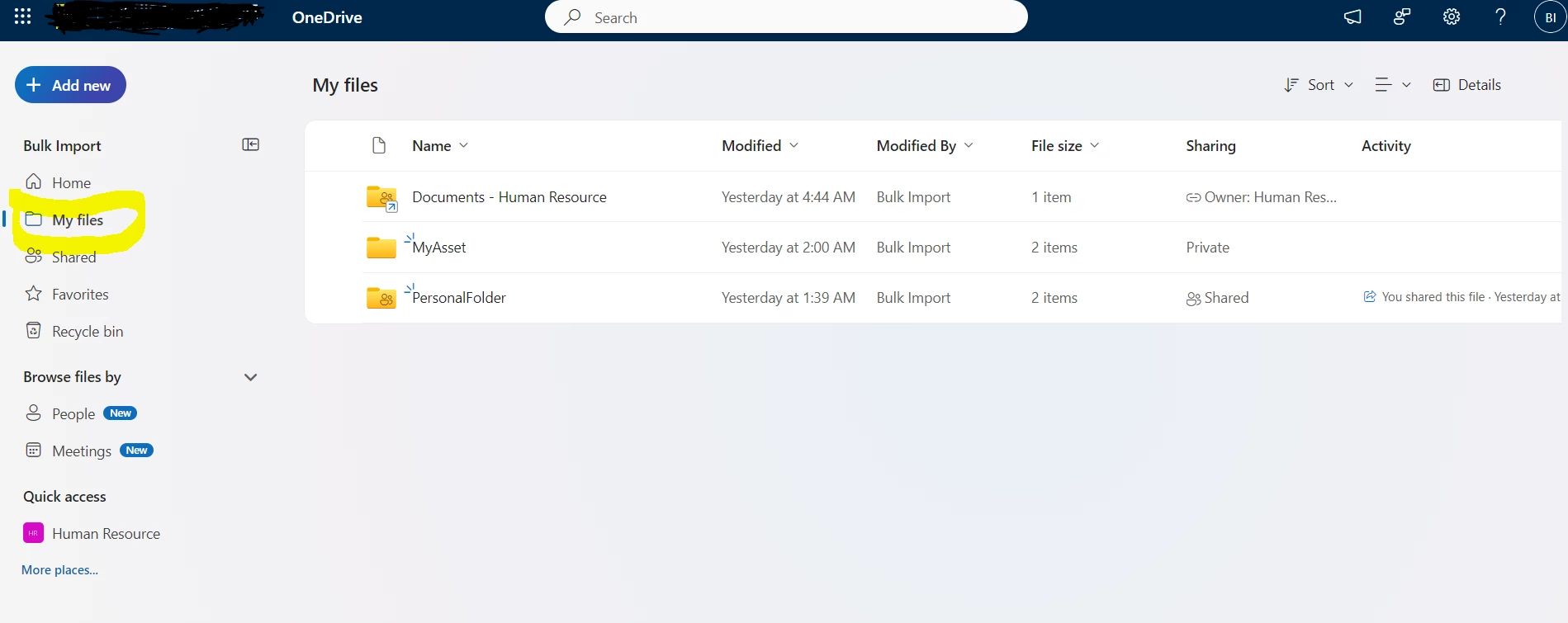 I have done the bulk import from OneDrive to AEM Assets. Where I can import assets from My Files as shown below. I was referring the below document for configuring OneDrive to AEM Assets.
