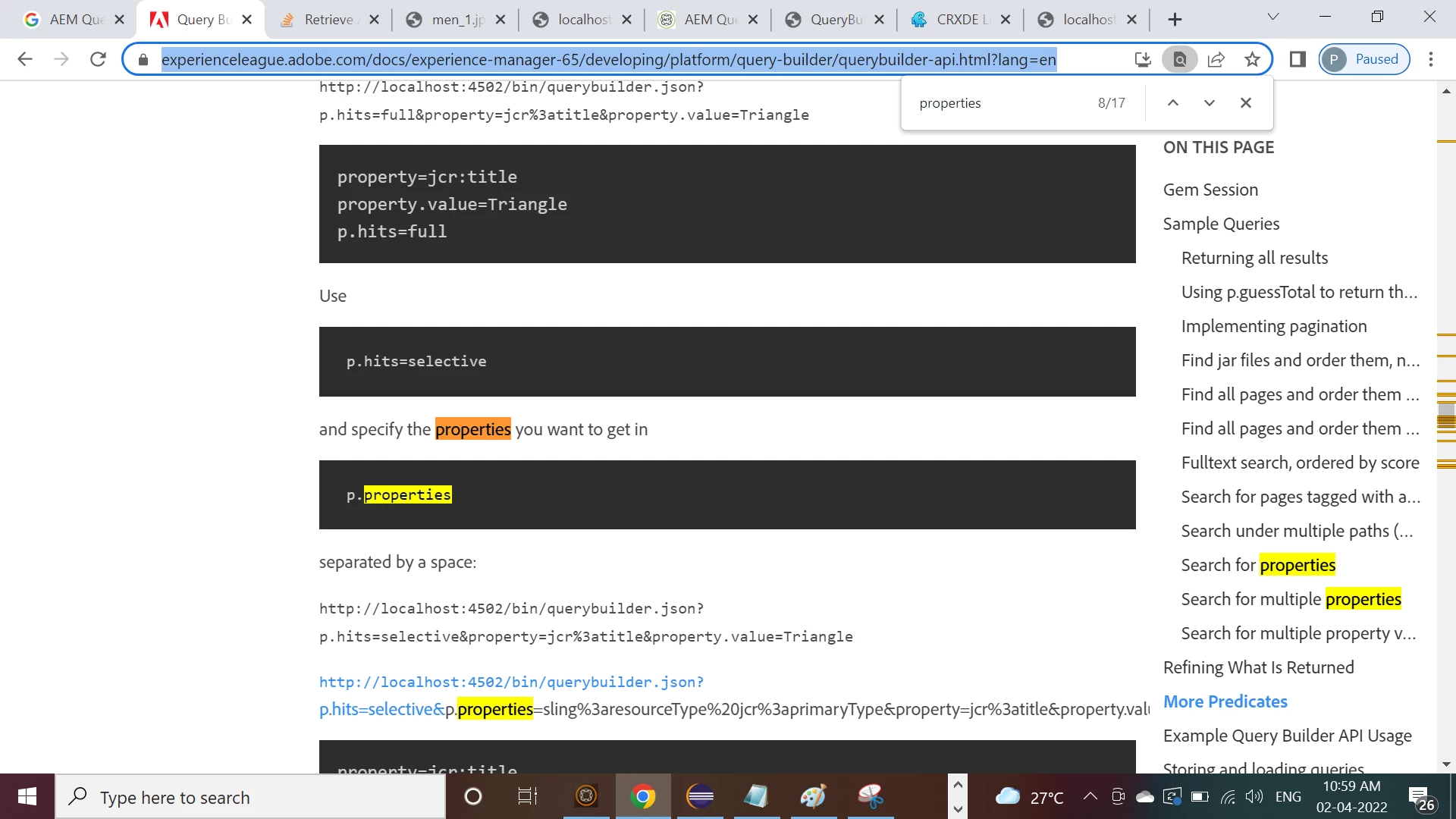 We are wanting to create a string of metadata values that will return only those wanted values as JSON. Can AEM Query builder be used to build this query or test it? If so, are there are documents around what metadata values are available?
