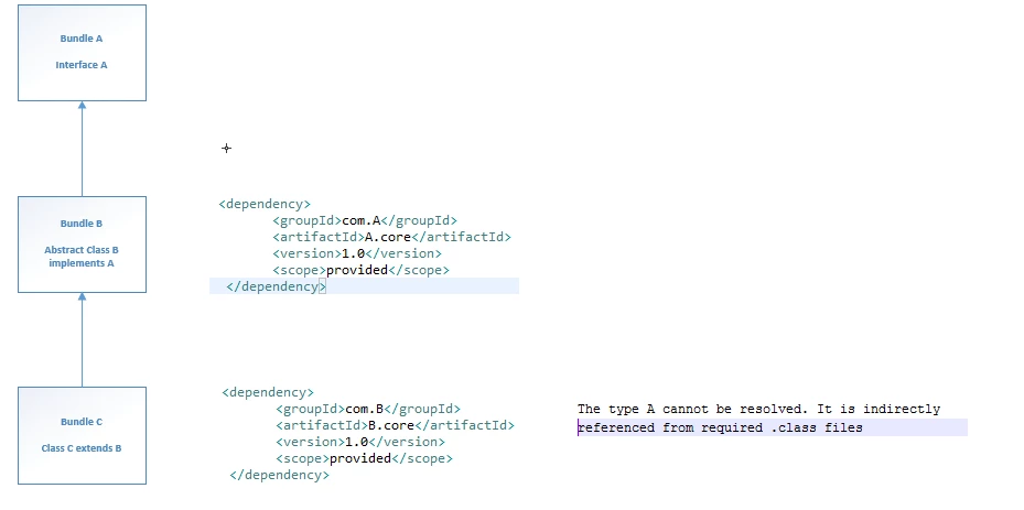 Interface A is in Bundle A. Abstract Class B implements A in Bundle B. Added A dependency in B pom.xml. Now Class C in Bundle C extends Class B from bundle B. Hence added bundle B dependency in Bundle C pom.xml as shown in the attached image. But the issue is I still getting compilation issue in Bundle C saying it is not able to resolve Interface A which is in Bundle A.