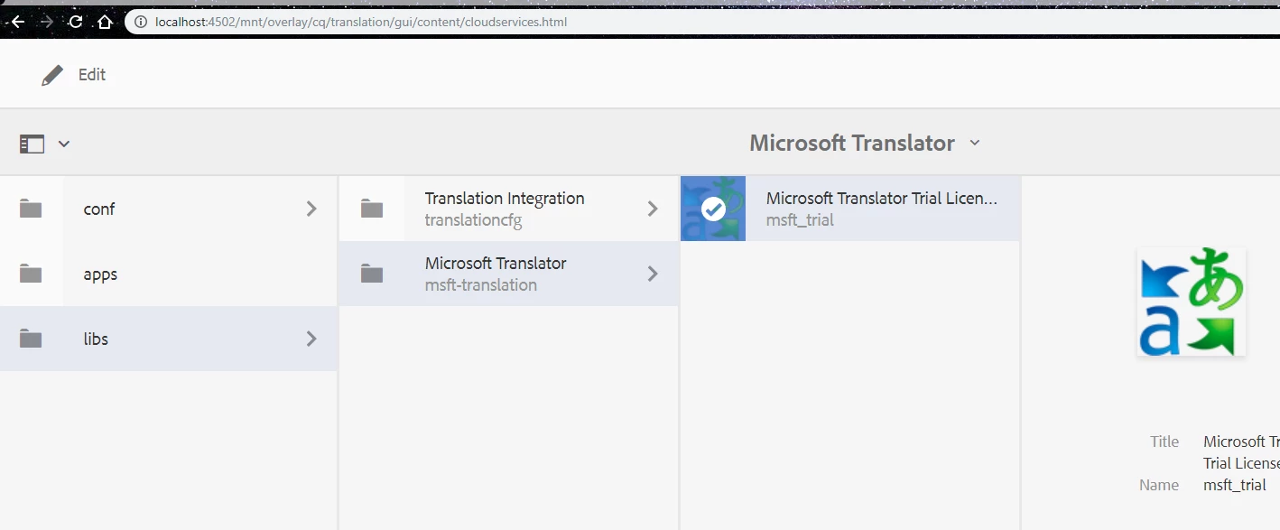 Please check whether Microsoft translations is exists or not by referring this URL http;//localhost;402/etc/cloudservices.html