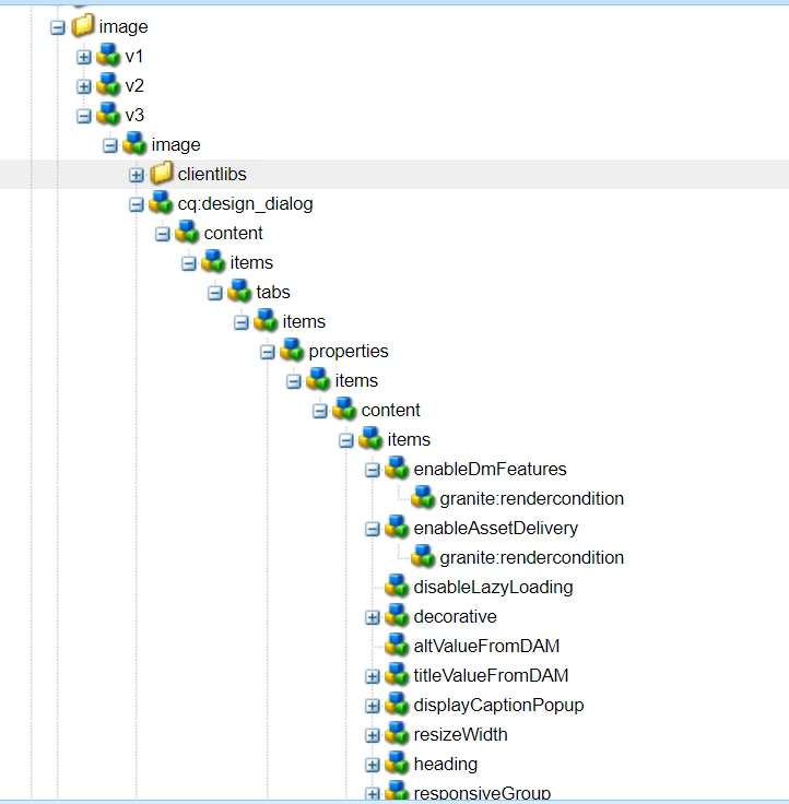 The teaser refers to core/wcm/components/image/v3/image/cq:dialog/content/items/tabs/items/asset which further has the design dialog property (enableDmFeatures)