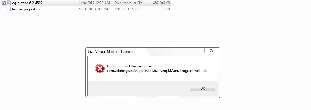 could not find the main class com.adobe.granite.quickstart.base.impl.main