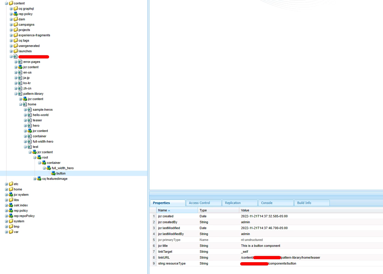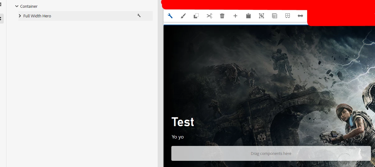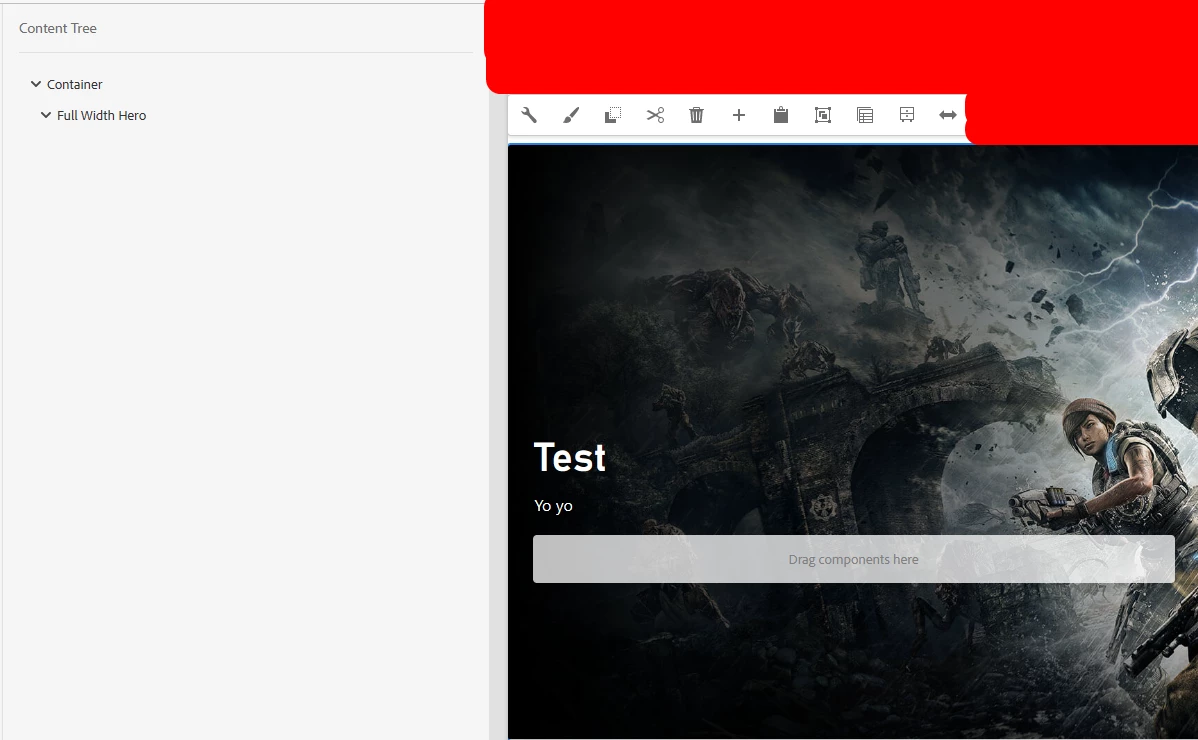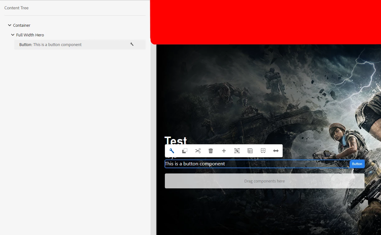 And everything works fine up until this point. I have configured the policy and it works, and the component renders correctly. When I create an instance of this component, I can see the placeholder to insert the necessary child components (in this case, I am allowing different types of buttons within a custom Hero component).