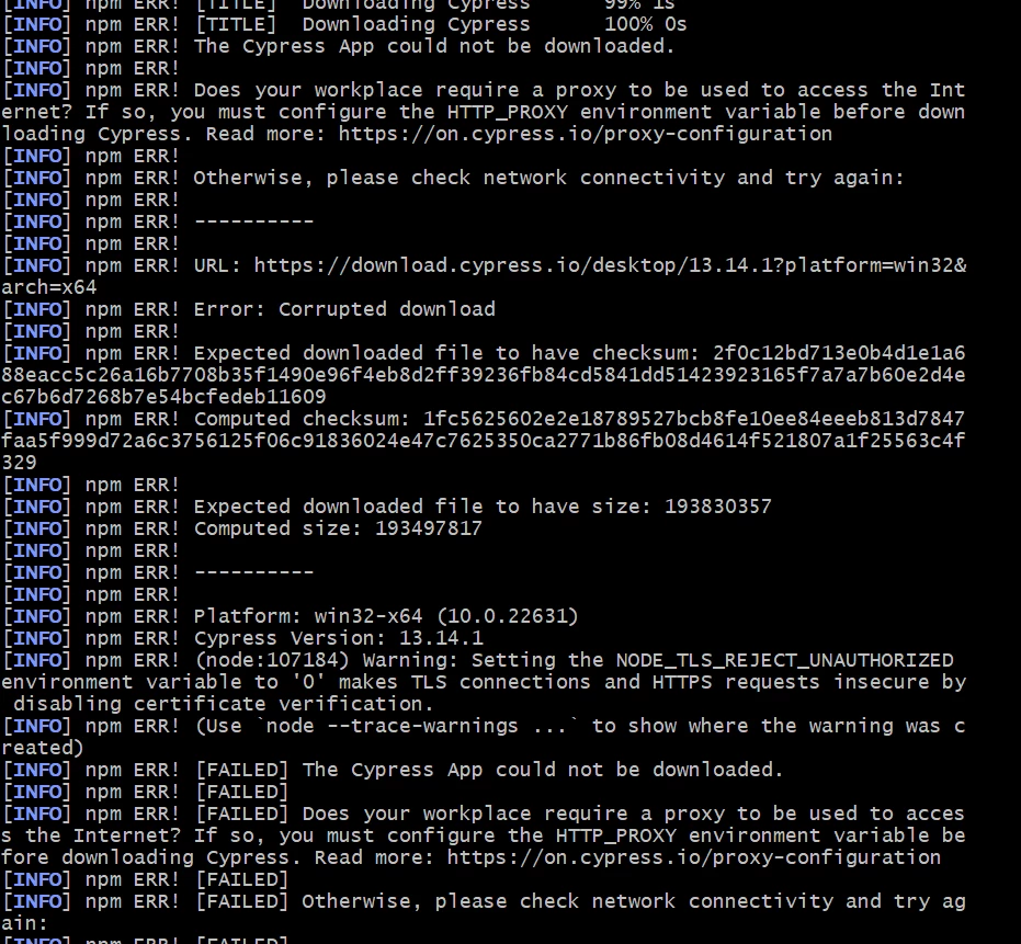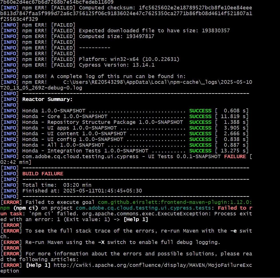 "Failed to execute goal com.github.eirslett:frontend-maven-plugin:1.12.0:npm (npm ci) on project com.adobe.cq.cloud.testing.ui.cypress.tests: Failed to run task: 'npm ci' failed. org.apache.commons.exec.ExecuteException: Process exited with an error: 1 (Exit value: 1)"