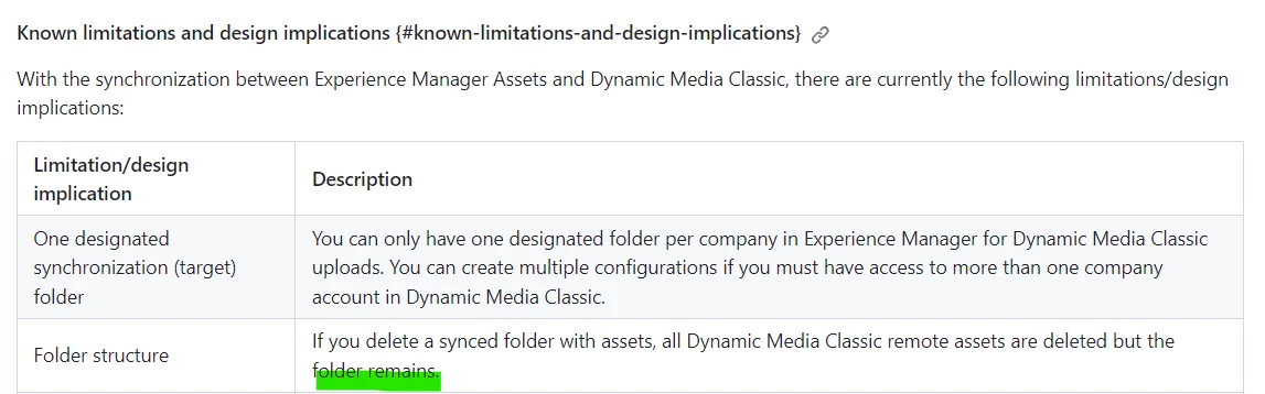 I have configured the dynamic media in my environment. Dynamic Media sync mode - Inherit and Dynamic Media Publish mode - Immediate. When we create any folder in aem, it gets immediatly synced to DM. When we delete the folder in aem, it removes all the assets inside the folder but the folder and sub-folders. Any reason behind this? We have to manually delete the folder in DM. If there's any solution let me know.