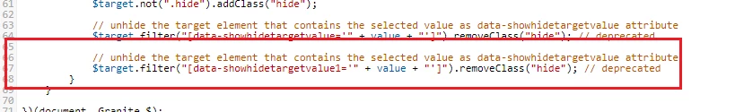 if you check this line, you can see that only the element with the "showhidetargetvalue" will be visible and everything else will be hidden via line 63. So what we should do is to modify this line to make the field visible for one more value. The beauty of data- attributes is that you can give any name and add a data-* attribute to your HTML element. So I will create another data-* attribute element and add to the field.