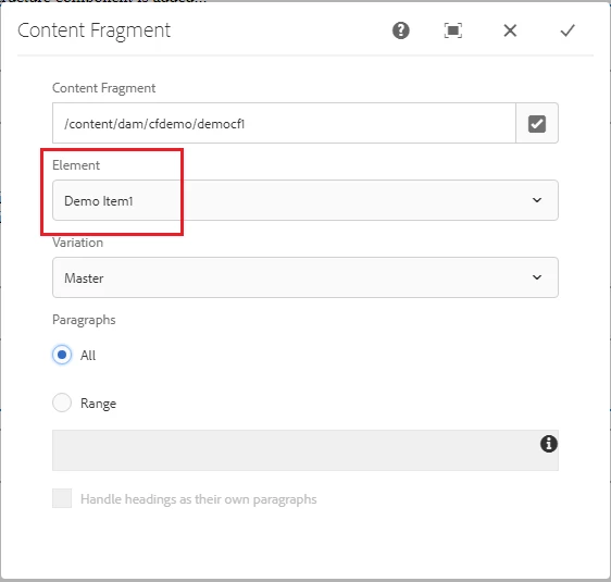 - I configured the Content Fragment Component by choosing my Content Fragment path (Which I saved in above step#3).