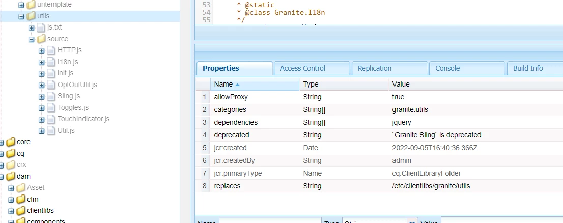 2. The granite.utils clientlib category at /libs/clientlibs/granite/utils has I18n.js with below code -