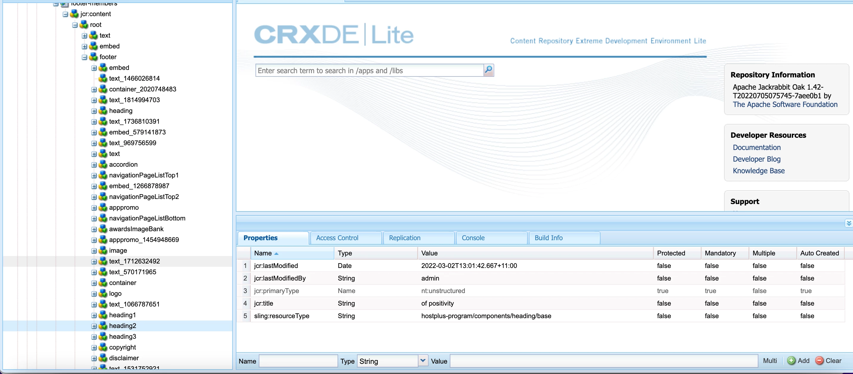 I can add component into footer on top of existing image or text component using + symbol(add component) and I see those dropped text component persist in CRXDE as nodes as below:
