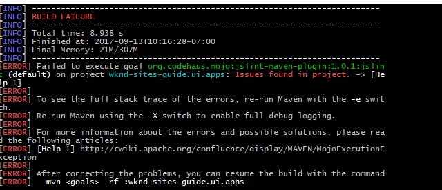 Failed to execute goal org.codehaus.mojo:jslint-maven-plugin:1.0.1:jslint (default) on project wknd-sites-guide.ui.apps: Issues found in project. -> [Help 1]