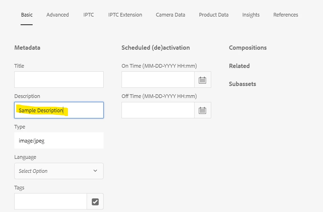 I've put in some description in the images that I have uploaded in the assets. Now I want to fetch that data automatically while the image is rendered. How can I do it?