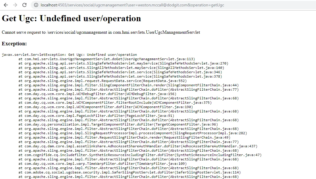 But when i hit the servlet using the path ( http://localhost:4503/services/social/ugcmanagement?user=weston.mccall@dodgit.com&operatio n=getUgc ),i am getting error 500. Attached sample code and the error message, please advice what i am missing.. and also advice it there any way to get bulk export of comments.