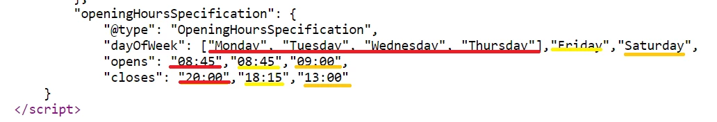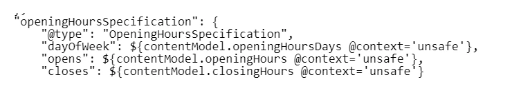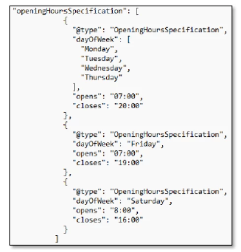 @arindam6600 This would require you loop through dayofweek, opens and closes list and pick the items for the same index and create the openinghoursspecification array and return it in the model. Assuming you have equal number of items in each of dayofweek, opens and closes list.