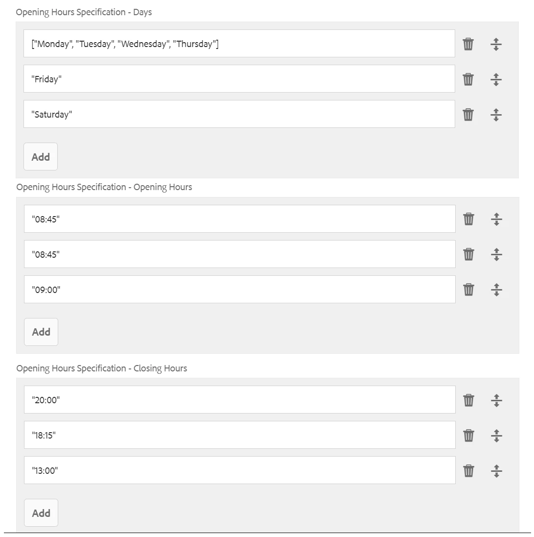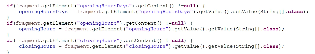 private String[] openingHoursDays; public String[] splitArray; JSONObject jsonObject = new JSONObject(); JSONArray jsonArray = new JSONArray(); @PostConstruct private void initModel() { Resource fragmentResource = null; if (fragmentResource != null) { ContentFragment fragment = fragmentResource.adaptTo(ContentFragment.class); if(fragment.getElement("openingHoursDays").getContent() !=null) { openingHoursDays = fragment.getElement("openingHoursDays").getValue().getValue(String[].class); } } } public String[] getOpeningHoursDays( ) { return openingHoursDays; } public ArrayList<String> getSplitArray() { for (int i = 0; i < openingHoursDays.length; i++) { splitArray = openingHoursDays[i].split("-"); //splitting the array based on delimiter (-) try { jsonObject.put("@type:", "OpeningHoursSpecification"); //creating the JSON objects jsonObject.put("dayOfWeek", splitArray[i]); //creating the JSON objects at index 0 jsonObject.put("opens", splitArray[i+1]); //creating the JSON objects at index 1 jsonObject.put("closes", splitArray[i+2]); //creating the JSON objects at index 2 } catch (JSONException e) { LOGGER.info("Unable to create JSON object"); } jsonArray.put(jsonObject); //creating the JSON array from the JSON objects } ArrayList<String> listdata = new ArrayList<String>(); //For storing the data from JSON array in an array list if (jsonArray != null) { for (int m=0;m<jsonArray.length();m++){ try { listdata.add(jsonArray.getString(m)); //Add JSON array data to the list } catch (JSONException e) { LOGGER.info("Unable to create Array List"); } } } return listdata; }