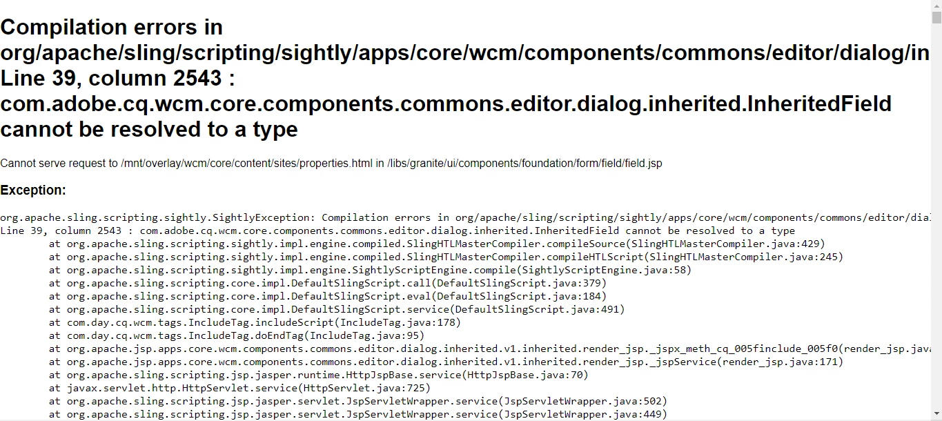 Getting Sightly Exception after selecting and Clicking on page properties icon. Attaching error screenshot below. Please help me out with this.