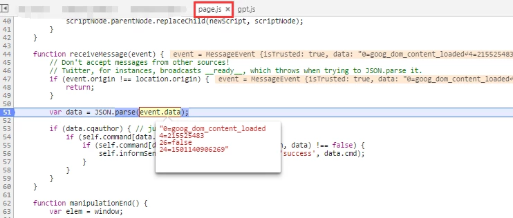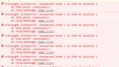 But AEM generated a page.js. There is a receiveMessage function to listen window.postMessage event. And it intercepts and want to convert these data to JSON.