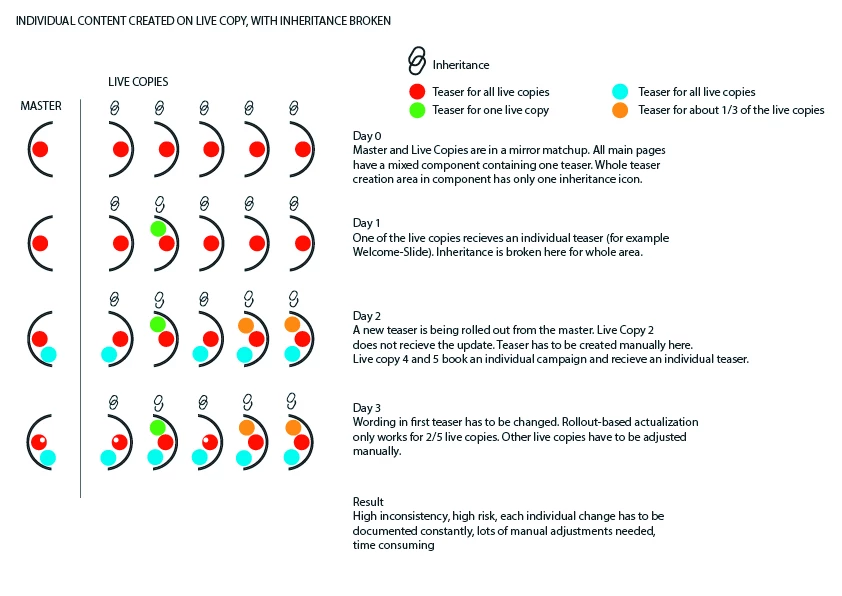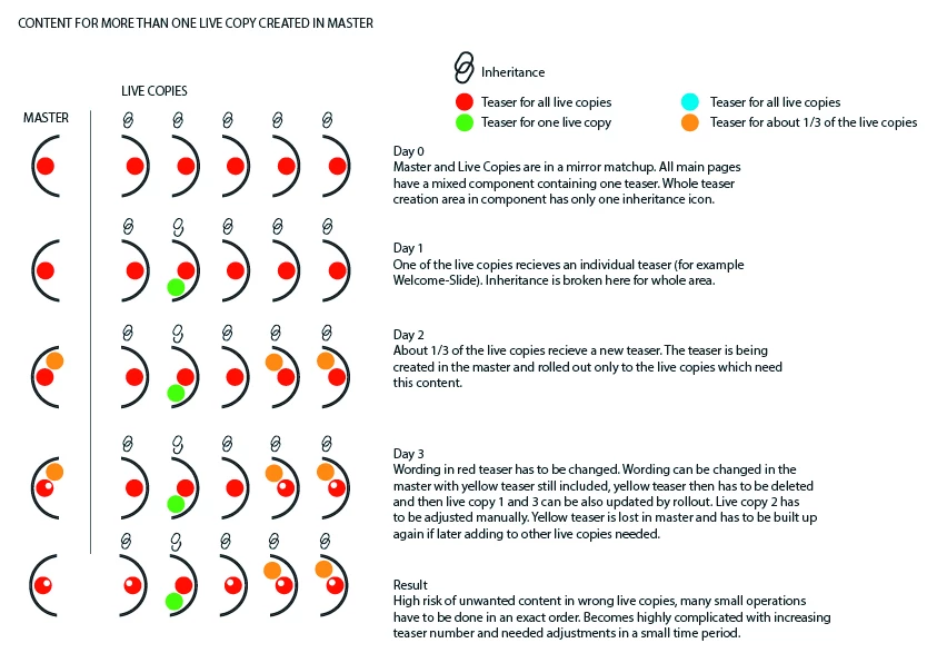 we are dealing with some issues managing pages which combine inherited content from the master and individual content. I have made two visualisations which show one of the issues - the process of rolling out teasers and creating individual ones by breaking the inheritance in the live copy component - in a simplified way (we actually have a much larger amount of live copies). I am not sure if the problem is the wrong approach, a wrong setup of these mixed page components or anything else. I can`t find many use cases for experience fragments, but I am wondering if they could help us in this case (by creating a fragment out of the teaser component and creating versions of it - for example for the yellow teasers in my visualisation).