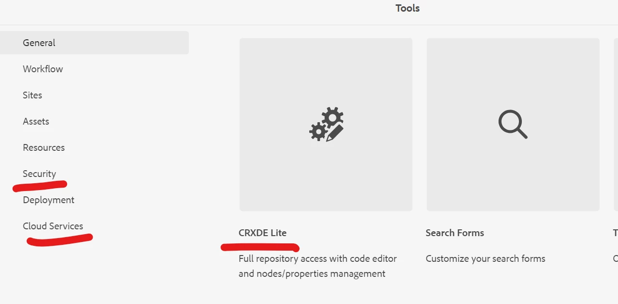 How do i enable/disable permissions to cloud services configurations, crx/de etc. in tools?