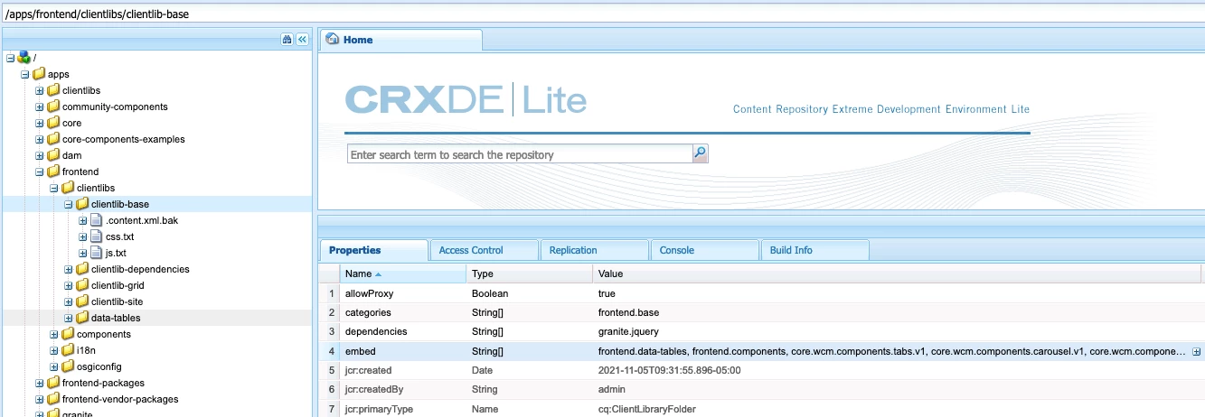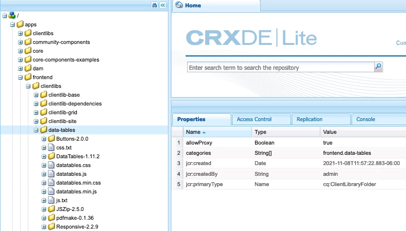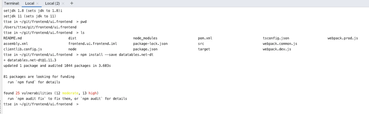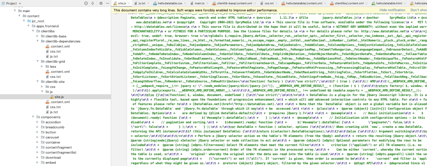 So in my AEM Sites project, I want to use the ui.frontend module to add the JavaScript files for datatables.net by using npm.