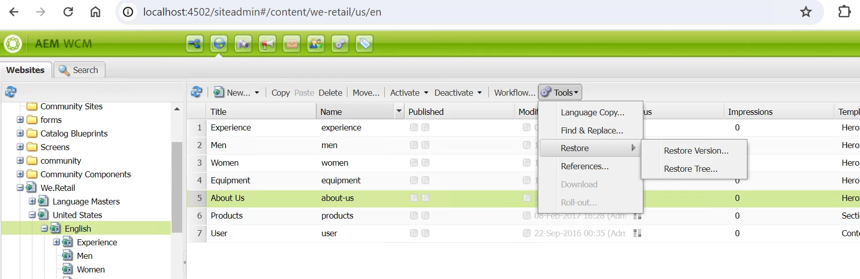 I have added one heading as "Test" in About Us page. and how can I see the history of authored content.