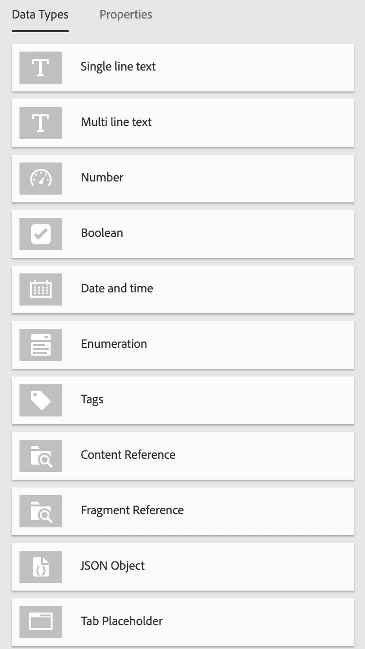 Currently we have following data type available for Content fragment model. Can we create customer data type ?