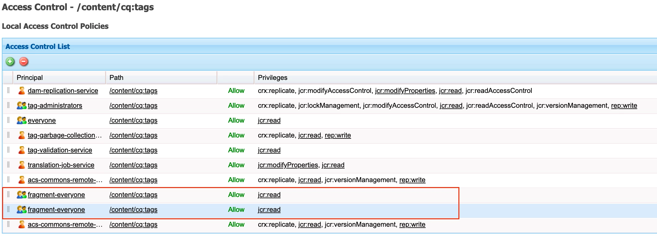Caused by: org.apache.jackrabbit.oak.api.CommitFailedException: OakAccessControl0013: Duplicate ACE '/content/cq:tags/rep:policy/allow7' found in policy